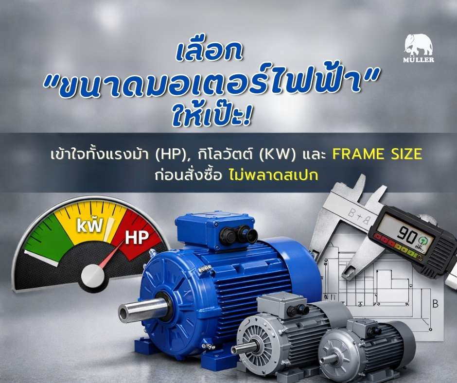 🔧 เลือก “ขนาดมอเตอร์ไฟฟ้า” ให้เป๊ะ! เข้าใจทั้งแรงม้า (HP), กิโลวัตต์ (kW) และ Frame Size ก่อนสั่งซื้อ ไม่พลาดสเปก การเลือก ขนาดของมอเตอร์ไฟฟ้า เป็นเรื่องที่หลายคนสับสน เพราะคำว่า “ขนาด” อาจหมายถึงได้มากกว่า 1 อย่าง ทั้ง • ขนาดกำลังของมอเตอร์ (แรงม้า / กิโลวัตต์) • ขนาดทางกายภาพของตัวมอเตอร์ (ความสูงเพลา ระยะรูน็อต หรือ Frame Size) บทความนี้จะพาคุณเคลียร์ทุกจุด ตั้งแต่คำถามยอดฮิตอย่าง👉 มอเตอร์ 7.5 แรง เท่ากับกี่กิโลวัตต์ ไปจนถึงการถอดรหัส Frame 132S แบบเข้าใจง่าย ใช้ได้จริงหน้างาน 1️⃣ ขนาดกำลังของมอเตอร์: มอเตอร์ 7.5 แรง … 🔧เลือก “ขนาดมอเตอร์ไฟฟ้า” ให้เป๊ะ!